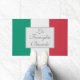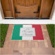 Esta alfombra de la puerta de diseño de Italia presenta un nombre de familia de ejemplo en el centro impreso en una elegante fuente de escritura de color gris. Puede personalizar la alfombra para incluir su propio nombre familiar o mensaje de personalizado. El texto está situado en el centro, sobre todo sobre la parte blanca y entre el verde y el rojo.