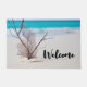 Un felpudo de bienvenida con una preciosa fotografía. Agua tropical azul y espumosidad en el fondo. Colección de conchas marinas y tallos en una playa de arena blanca.