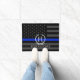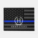 Un doormat conocido con monograma y de encargo que ofrecía una línea azul fina policía diseñó la bandera americana. El monograma se centra dentro de una guirnalda estilizada blanca con el texto del apellido en el texto blanco debajo. Una manera elegante y elegante de hacer una impresión en su umbral mientras que representa el azul.