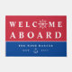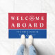 Estera de puerta náutica para su barco en rojo y azul con la recepción a bordo de escrito en blanco. El o en la recepción se substituye por la rueda de una nave. Personalice el felpudo del barco con el nombre del barco.