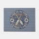 Doormat de una casa lacustre con remos pintados y salvavidas sobre madera oscura y fondo de rayas azules. Una casita de campo de verano decorada para alegrar tu estancia.