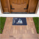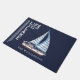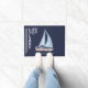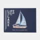 Doormat de casa de lago único personalizado con el nombre de su familia y decorado con un velero con velas azul cielo, rayas blancas y el dicho "La vida es mejor en el lago". La plantilla facilita el escribir el nombre de la familia, el nombre de un barco u otro texto.
