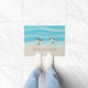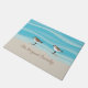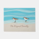 ¡Vista para arriba su casa de playa con este doormat personalizado! Dos lavanderas skitter a lo largo del borde de un mar azul sobre el apellido (o el otro texto) escrito en la arena. ¡Es perfecta para celebrar un boda de playa, o expresar un amor del océano y de los pájaros de orilla lindos!