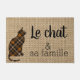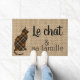Doormat con un encantador gato encorvado en el fondo de burlap y una graciosa cita francesa " le chat et sa famille " = el gato y su familia . Ideal para la casa de un amante de los gatos de habla francesa. También una buena advertencia para aquellos que tienen alergia felina . Diseño de Alma Wad .