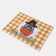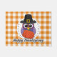 Oveja peregrina sobre un fondo de patrón de búfalo blanco naranja con la leyenda "Feliz Día de Acción de Gracias".