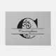 En esta estera distintiva de puerta, su nombre está en el guión en el centro de una letra dividida C. El nombre y la letra están en negro, y se muestran en un fondo medio a gris claro. Puede cambiar el color de fondo, si lo desea, eligiendo Editar diseño. ¡Elegancia para tu entrada!