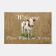 Bienvenidos, por favor limpie el texto de sus cascos con una vaca sobre un fondo rústico de arpillera.