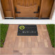 Perro Tema limpie sus garras de Ricaso con rayas grises y negras con círculos verdes brillantes y una huella de pata