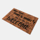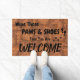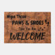 ¡Este doormat de la diversión dice el "trapo esas patas y zapatos!! Entonces usted es RECEPCIÓN" que las marcas de exclamación son shoeprints realmente minúsculos, añadidos para un poco banal. Cuatro pawprints minúsculos añaden un tacto del cuteness. El fondo ofrece un falso modelo de madera del entarimado (impresión de la foto).