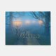 Cuatro lámparas brillantes sobre cuatro farolas brillan a través de una densa niebla, iluminando un camino sinuoso a través de las sombras y los resguardos de árboles de invierno.