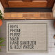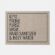 Este divertido diseño de felpudo presenta las palabras "Llaves, teléfono, bolso, máscara, desinfectante de manos, agua bendita". Personaliza esta linda alfombra de puerta de faux arpillera rústica con tus propios recordatorios personalizados para salir de casa. El regalo perfecto y único para estrenar casa o para nuevos propietarios.