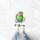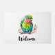 Un portero de bienvenida con un bonito ilustracion de loro. Un pequeño loro verde con colores azules y amarillos que se mezclan. El cuello tiene una vibrante sombra de rosa rojizo.