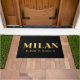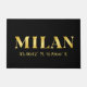 El diseño del doormat delantero Lux presenta la ciudad de Milán, las coordenadas del mapa de latitud y longitud de Italia en fuentes doradas sobre fondo negro.