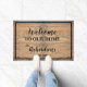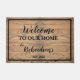 La alfombra de diseño rústico de madera de madera de la puerta dice "Bienvenidos a nuestra casa" y está personalizada con "NOMBRE" y el año establecido. Una franja negra bordea el borde de la alfombra.