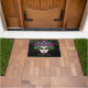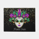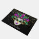 Este doormat se muestra con un fondo de color negro con estrellas de oro con una huella de máscara de carnaval festivo de Mardi Gras. Personalizar este artículo o compra tal cual. Imagen de stock