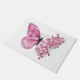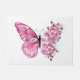 Arreglo floral de mariposa rosa con flores japonesas de cerezo rosadas sobre fondo blanco.