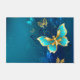 Oro volador, mariposa de joyas sobre fondo textural azul. Diseño con mariposas.