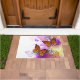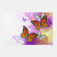 Naranja, mariposas monarcas detalladas sobre la luz, púrpura, pintoresco fondo pintado.