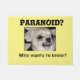 A veces hay que hacer chistes para cuidar el blues. Agárrenlos como este Chihuahua con el tembloroso texto paranoico que hace con el Paranoico Paco. En realidad no es tan malo...cierra las puertas, revisa las ventanas y cuelga debajo de las sábanas para ver algunas telenovelas. No te dirán. Deja que el pequeño perro te inspire a crear tu propio texto y fuente, si quieres.