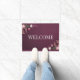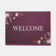Esta imagen de alfombra de bienvenida presenta un lujoso fondo burdeos, creando una rica y atractiva estética. Las flores de color rosa, lavanda y oro rosa están cuidadosamente dispuestas en las esquinas superior izquierda e inferior derecha, creando una composición visual equilibrada. La palabra "Welcome", centrada entre los arreglos florales, está escrita en blanco con mayúsculas. Las flores tienen un estilo realista con gradientes de color morado a rosa claro. La alfombra de bienvenida es una estética moderna de bienvenida en tonos modernos y de moda. La alfombra tiene un sólido soporte de acción de látex que permite un agarre no deslizante. La alfombra está autorizada para zonas interiores y exteriores cubiertas. Las dimensiones de las alfombras de bienvenida son de 18" por 24".