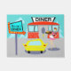 Sirva algo especial con este Personalizable de los años 50 de Diner Door Mat. El diseño del dibujo personalizado se caracteriza por un edificio de ladrillo rojo con ventanas azules, puertas dobles grises y un cartel blanco que dice "Diner" en el techo. En el estacionamiento, hay una segunda señal en un poste. El letrero tiene un fondo turquesa y una flecha roja que apunta hacia la cena. El cartel del personalizable ha hecho su trabajo porque hay un auto amarillo brillante con aletas aparcadas al lado. Aunque no podemos verlos, los pasajeros del auto deben estar golpeándose los labios. Un lindo y joven bufete está patinando su camino al auto. Su pelo de morena está en una cola de caballo. Lleva un uniforme corto y rosa con guarnecido negro y un delantal blanco. Equilibrado por un lado, el lúpulo lleva una bandeja negra con una hamburguesa gigante y una refrescante botella de refresco, anticuada. El fondo de la cena está verde azulado de nubes azules claras y siluetas de cedros.