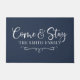 Una moderna alfombra de puertas caligráficas que te hará sentir bien. Un gran regalo para recién casados o nuevos propietarios de casas, nuestro personalizado viene y se queda doormat en elegantes y duraderas características azul marino "Come and Stay" en un moderno y elegante guión de caligrafía escrita a mano. Personalice su nombre familiar con letras blancas clásicas. Diseñado para ti por Blackberry Boulevard.