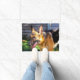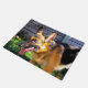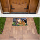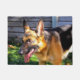 Esta alfombra de puerta tiene una foto de un pastor alemán encima.