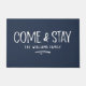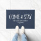 Una moderna estera rústica de puertas que te hará sentir bien. Un gran regalo para recién casados o nuevos propietarios, nuestro personalizado viene y se queda doormat en elegantes y duraderas características azul marino y blanco "Come and Stay" en letra moderna y rústica escrita a mano. Personalice su nombre familiar con letras blancas clásicas. Diseñado para ti por Blackberry Boulevard.