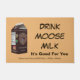 Cartón de leche de la mundialmente famosa y mítica granja lechera Matanuska Moose Milk en Willow Alaska; no muy lejos de Anchorage. También aparece el lema "Beba leche de alce, es bueno para ti". La imagen del logo muestra a una sirvienta ordeñando a mano a Matilda, la primera alce lechera de la granja. Créanlo o no, hay moras de alce; un pequeño número en Rusia y uno en Suecia. La leche de alce se cultiva comercialmente en Rusia. Un ternero de alce nacido en una granja es tomado de su madre en las 2-3 horas siguientes al nacimiento y es criado por la gente. Primero se alimenta con una botella de un sustituto de la leche y después se alimenta de un cubo. Los animales se imprimen y se unen a los humanos. La leche es alta en materia de grasa butírica (10%) y sólidos (21,5%), según datos recogidos en alce ruso; la investigación sobre la leche de alce estadounidense está en un estado menos avanzado que en Rusia, pero parece indicar que el alce estadounidense tiene concentraciones aún mayores de sólidos en su leche. Se dice que la leche de alce es un poco salada y amarga; con un toque de pino o agujas picantes. La leche de alce se cultiva comercialmente en Rusia. Un ternero de alce nacido en una granja es tomado de su madre en las 2-3 horas siguientes al nacimiento y es criado por la gente. Primero se alimenta con una botella de un sustituto de la leche y después se alimenta de un cubo. Los animales se imprimen y se unen a los humanos. Al igual que con el ganado lechero, los terneros son retirados de sus madres después de un corto tiempo. Los rusos dicen que Moose pronto reconoce a las sirvientas como su sustituto como sus terneros sustitutos. En este punto son liberados al bosque; pero visitan la granja todos los días para ser ordeñados durante el periodo de lactancia (normalmente, hasta septiembre u octubre). Durante el invierno, los animales deambulan libremente por el bosque circundante. Pero por lo general no se alejan demasiado, sino que pasan gran parte de su tiempo en los bosques cercanos donde se talan árboles, alimentándose de los subproductos de las operaciones madereras. Y conocen la granja como el lugar para raciones diarias de avena, y como un lugar seguro para dar a luz a sus hijos pequeños. Un sanatorio ruso sirve leche de alce a los residentes en la creencia de que les ayuda a recuperarse de la enfermedad o a manejar las enfermedades crónicas de manera más efectiva. Algunos investigadores rusos han recomendado que se utilice leche de alce para la prevención de enfermedades gastroenterológicas en niños. Se cree que la granja Elk (Moose se llama Elk in Europe) House (Älgens Hus) en Bjurholm, Suecia es el único productor mundial de queso de alce. El queso se vende por unos 500 dólares por libra. El restaurante del Algens Hus ofrece platos de queso de oso. Queso liso con pan o galletas, o mejor aún, mousse de alce congelado. Mejor servido con frambuesas.
