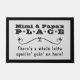 Bienvenidos a sus nietos con esta imponente alfombra de puertas con las palabras "Mimi & Papa's Place" y "¡Hay una gran spoilin aquí!" en tipografía moderna sobre un fondo gris plateado.