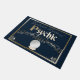 Esta alfombra de puerta temática de Halloween personalizado presenta un fondo morado oscuro de color azul marino con texto e imágenes brillantes.