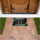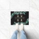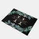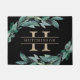 Elegante doormat botánico en negro rico presenta su monograma inicial único con su nombre familiar sobrepuesto, enmarcado por hojas de acuarela y follaje en ricos tonos de verde.