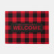 Esta alfombra presenta un cheque de búfalo negro y rojo con un nombre de familia de monograma rojo y un texto de "Bienvenida" en un fondo negro de burlap Personaliza con tu propio nombre o para regalar como regalo.