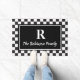 Elegante personalizado monograma doormat en el patrón clásico de colores negro y blanco a cuadros. Puede personalizar con el apellido de su familia en script y un primer monograma de estilo serif.