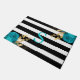 Este elegante diseño se caracteriza por sus ramos florales de color turquesa y dorado en dos esquinas sobre un fondo de rayas blancas y negras a la moda. Personalízalo con tu fuente inicial en serif turquesa.