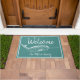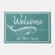 Doormat con temática náutica, con un ilustracion de ballenas blancas sobre el verde del océano y tu nombre familiar personalizado.