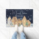 Esta alfombra de puertas de vacaciones personalizado y festiva presenta un acogedor tema nocturno de invierno. En la parte inferior se ve una imagen de color acuático de un pueblo Navidad de invierno con un barrio de casas. Algunas casas tienen sus luces encendidas, lo que da un ambiente cálido y acogedor. Los copos de nieve caen a través del cielo nocturno. La nieve cubre el suelo en la parte inferior y es acento con falso purpurina de plata. El purpurina de plata coincidente se espolvorea por el cielo.