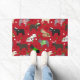 Agradables Bulldoges franceses vestidos con trajes festivos, sombreros de Papá Noel y suéteres de argyle con adornos navideños dispersos sobre un fondo rojo.