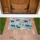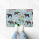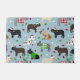 Agradables Bulldoges franceses vestidos con trajes festivos, sombreros de Papá Noel y suéteres de argyle con adornos navideños dispersos sobre un fondo azul.