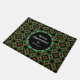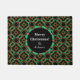 Este doormat de Navidades personalizados está decorado con un patrón de cinta entrelazada como formas inspiradas en las obras de arte de nudos celtas junto con coronas de hojas y bayas huecas, todo en un rojo y verde tradicional con acentos dorados amarillos.