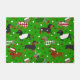Navidades golosos dachshund perros con abrigos negros, tostados y de manzana vestidos con ropa festiva, sombreros de Santa y suéteres de argyle con un patrón disperso de adornos navideños.