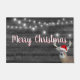 Gran ciervo negro con el gorra de Santa Claus y una cuerda brillante de bombilla en madera gris oscura.