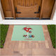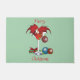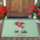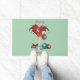 Un tierno dragón rojo en un vaso de martini con una aceituna verde. Ornamentos, aceitunas verdes y un regalo por todas partes.