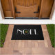 Doormat se muestra en blanco y negro con una impresión en blanco y negro de vacaciones. Personalizar esta alfombra o compra como está.