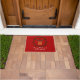 Imagen de un reno Navidad, rodeado por un hueco, sobre un fondo rojo oscuro.