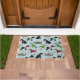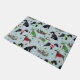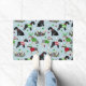Los Navidades sabrosos Schnauzers con sal y pimienta, y los abrigos negros y plateados llevan sombreros de Santa, corderos y sudaderas de argyle sobre un fondo azul con adornos dispersos.