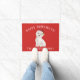 Adorables Navidades garabatos con un perro Westie usando un sombrero de santa en un fondo rojo festivo.