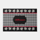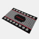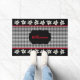 Tapón de puerta de inspiración alemana realizado en un patrón de verificación en blanco y negro, con acentos rojos y gráficos de bordes florales de Edelweiss. El texto rojo personalizado, en medio del tapete, lee Bienvenidos en alemán, Willkommen, y se puede cambiar para leer lo que se quiere.