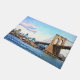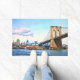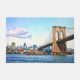 This photo captures the bustling waterfront near the Brooklyn Bridge and the developing skyline of Lower Manhattan around the turn of the 20th century, with various buildings visible in the background. The bridge's arches stand majestically over the calm blue waters.