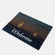 Doormat de bienvenida que se puede personalizar con una foto del atardecer / noche del puente Mackinac de la ciudad de Mackinaw, Michigan. El puente Mackinac es un puente suspensivo que atraviesa el estrecho de Mackinac para conectar las penínsulas superior e inferior de Michigan. ¿Buscando más impresiones o productos? Siéntete libre de visitar mi tienda: http://www.zazzle.com/timelessmomentsphtgy Esta foto fue tomada por Jennifer White con Timeless Moments Photography. Todas las imágenes tienen derechos de autor © Timeless Moments Photography.
